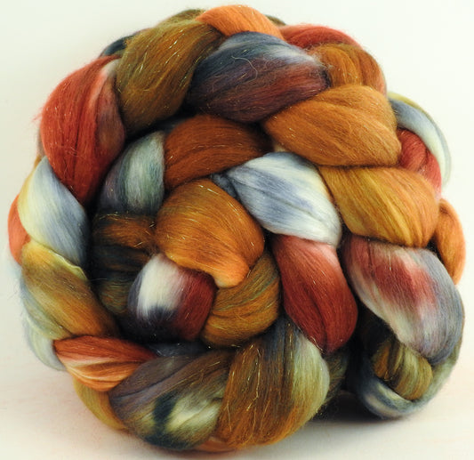Sumac (5.2 oz) - Batt in a Braid #48 -Superfine Merino/ Mulberry silk/ Camel/ Gold Stellina (55/25/15/5)