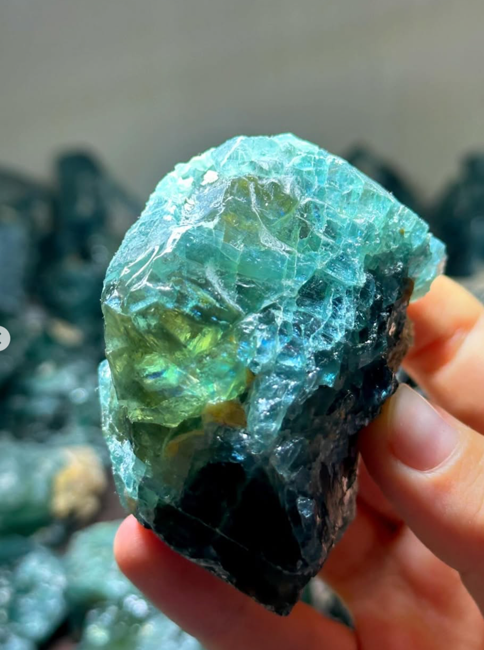 This complex green/blue sticklebatt is based on the Baikal Apatite mineral found in Lake Baikal. As the base we used a beautiful grey CVM X Rambouillet fleece we were lucky to get from SisterSheep of Golden Colorado.