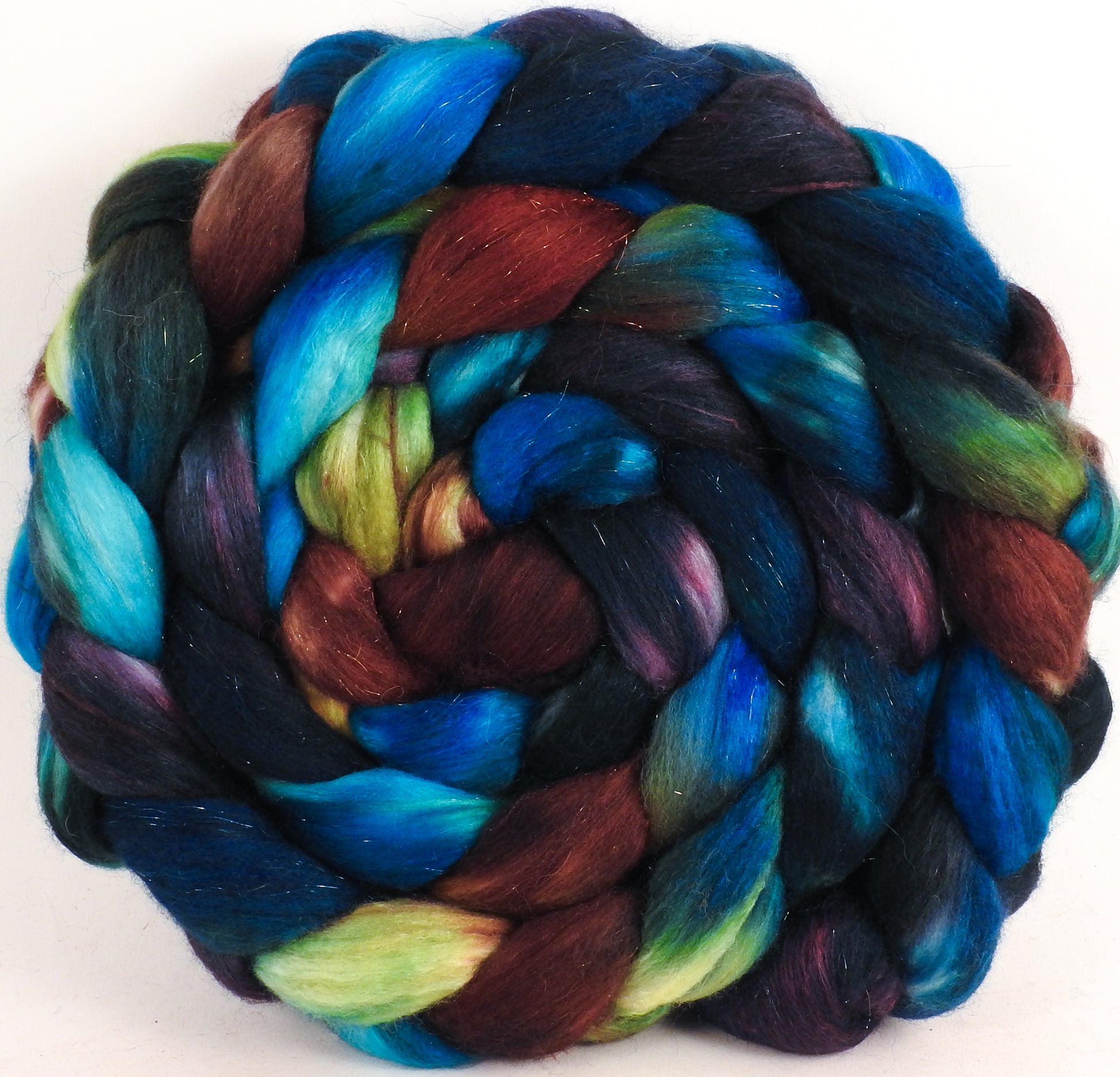Batt in a Braid #48 -Labradorite -(5.2 oz.) Superfine Merino/ Mulberry silk/ Camel/ Gold Stellina (55/25/15/5)