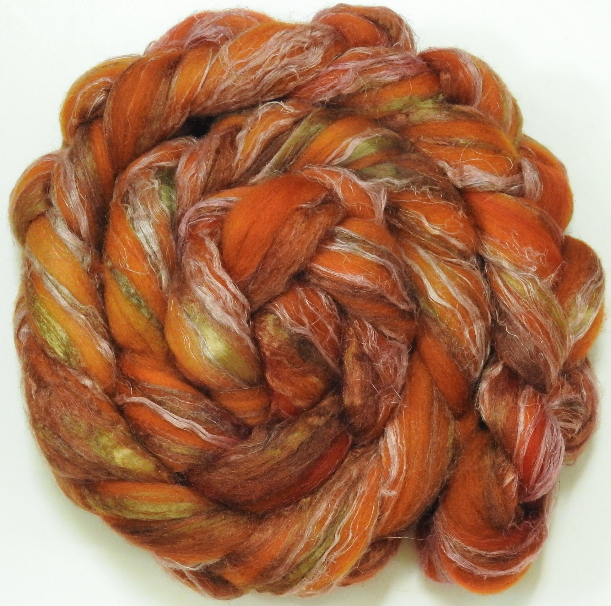 A fun textured blend we're trying out from what's readily available at the mill. Be prepared to pre-draft, and the flax will soften the more its handled!