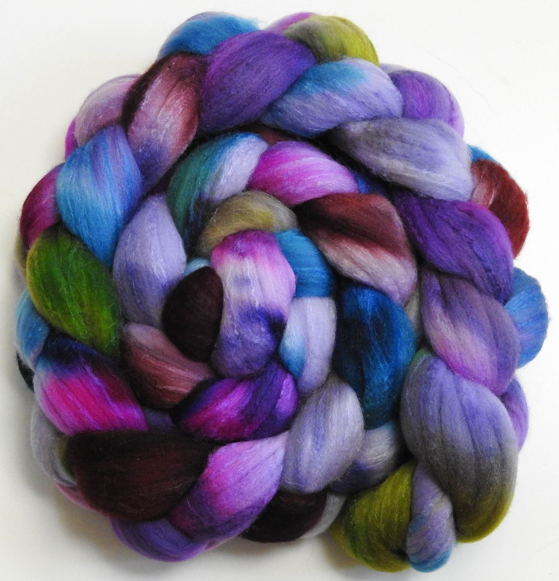 The premium wool in this small batch blend comes from a ranch committed to Climate-Beneficial farming practices for their pure-bred Rambouillet flock of sheep. The mill also spins yarn for one of the owners and can attest to the high quality of the wool which averages right around a soft 22 microns. There are some very narrow streaks of silk in the roving to help show the contrast with the shine of the silk after dying. .