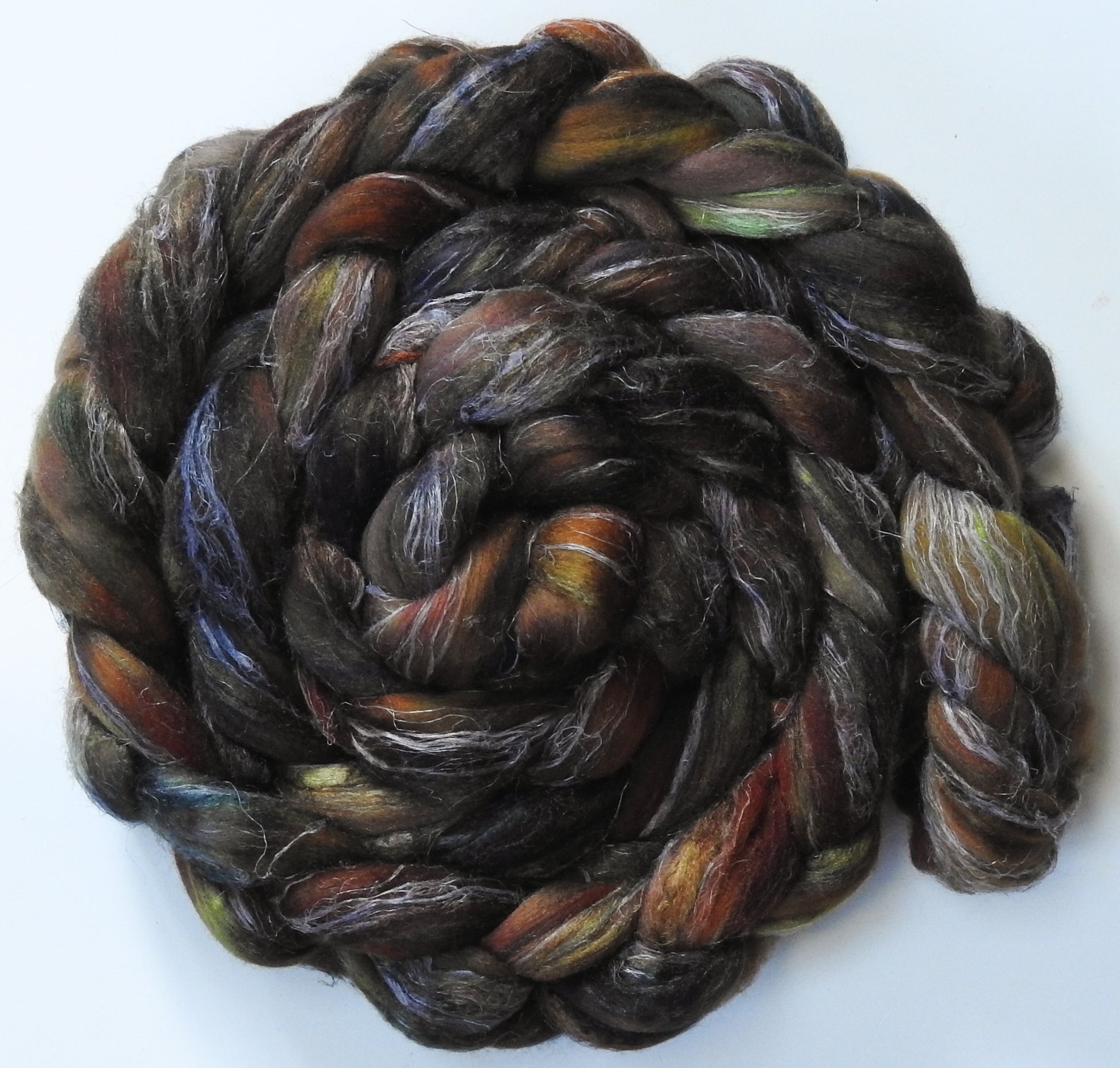 A fun textured blend we're trying out from what's readily available at the mill. Be prepared to pre-draft, and the flax will soften the more its handled!