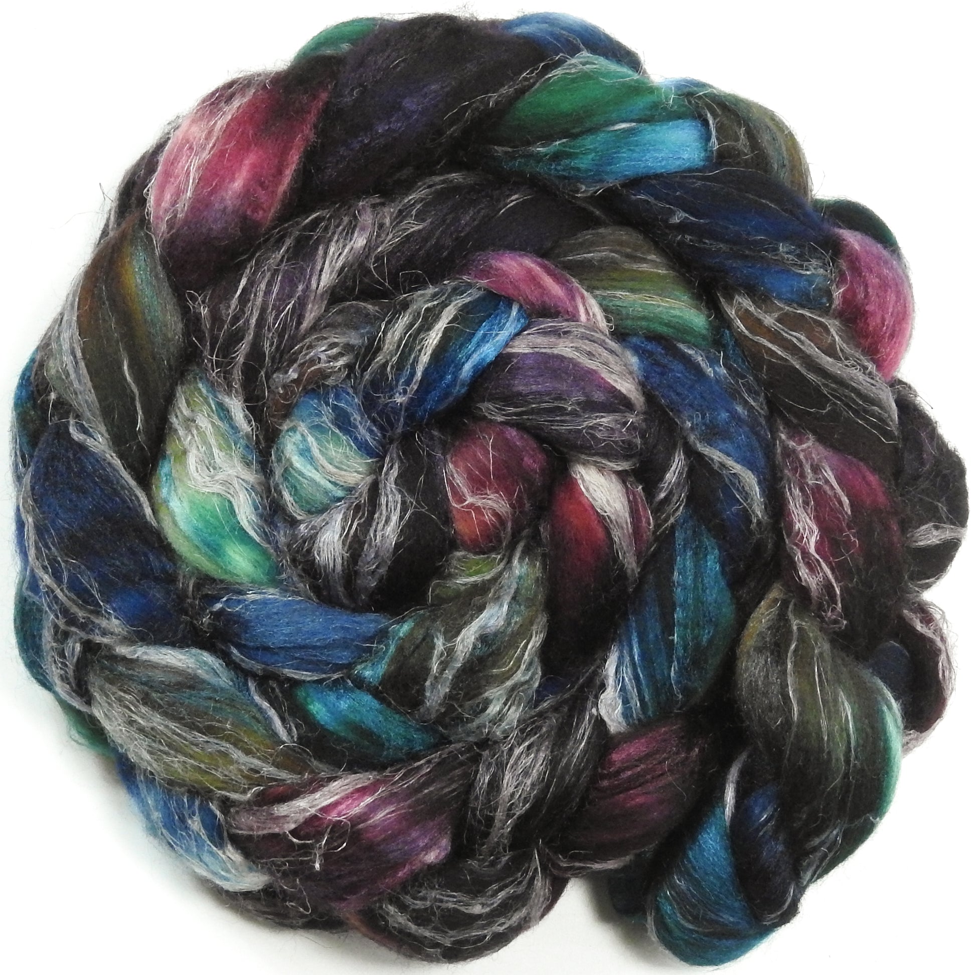 A fun textured blend we're trying out from what's readily available at the mill. Be prepared to pre-draft, and the flax will soften the more its handled!