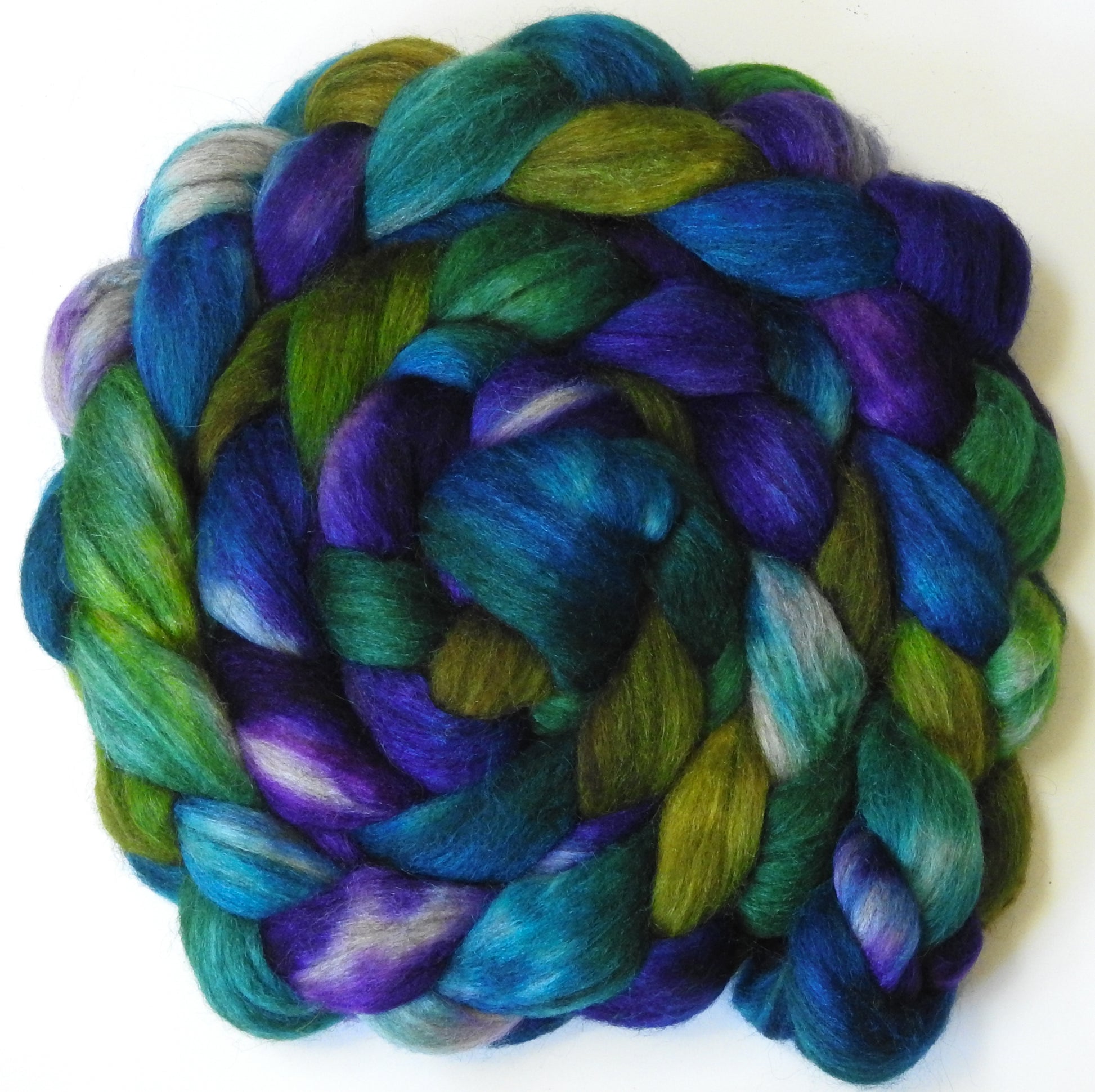 This is new blend that will only be available for a limited time, made of natural grey and white Andes wool and baby alpaca, blended with silk (50/25/25). It's soft and toothy at the same time, and gives a heathered look when over-dyed.