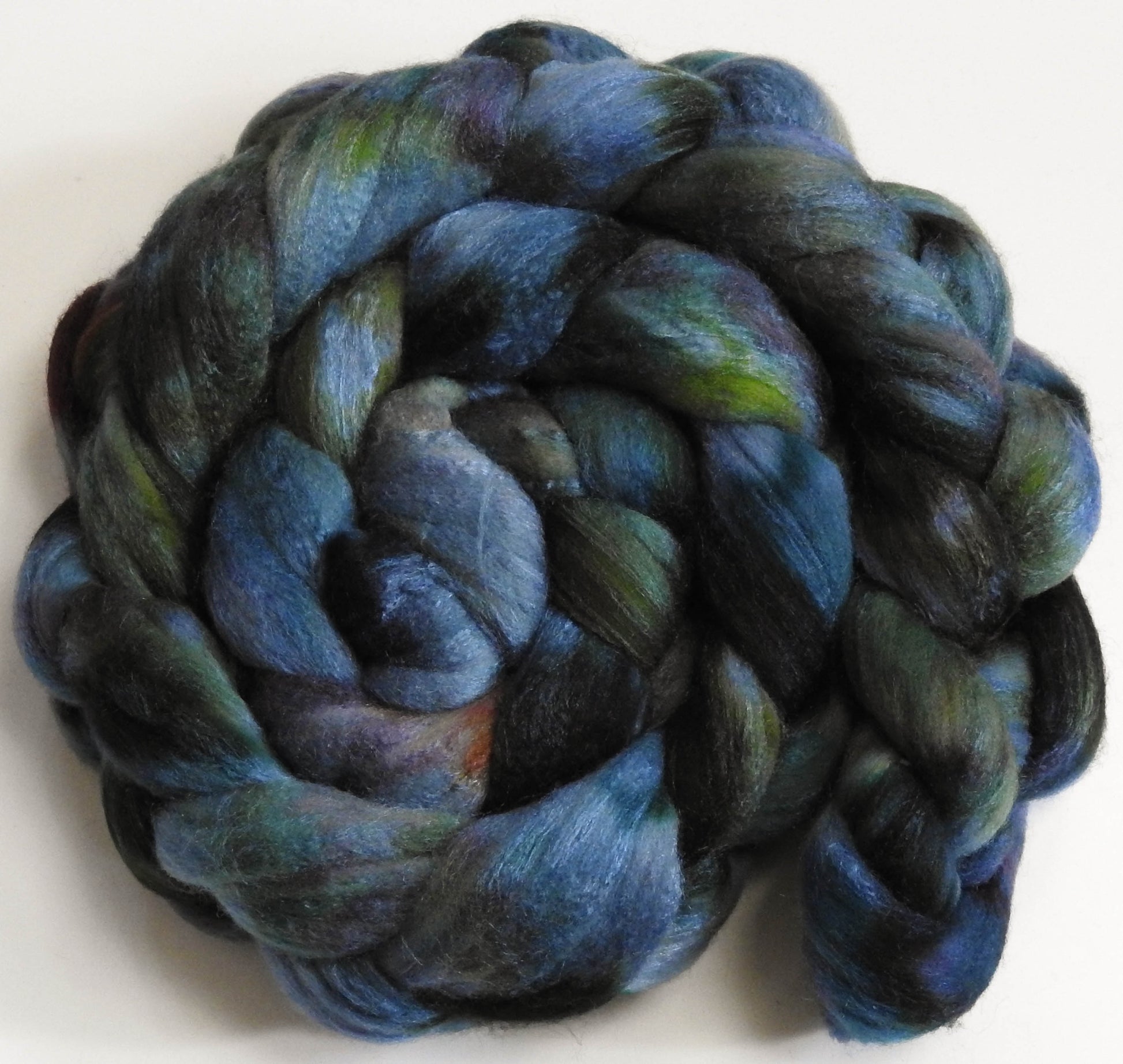The premium wool in this small batch blend comes from a ranch committed to Climate-Beneficial farming practices for their pure-bred Rambouillet flock of sheep. The mill also spins yarn for one of the owners and can attest to the high quality of the wool which averages right around a soft 22 microns. There are some very narrow streaks of silk in the roving to help show the contrast with the shine of the silk after dying. .