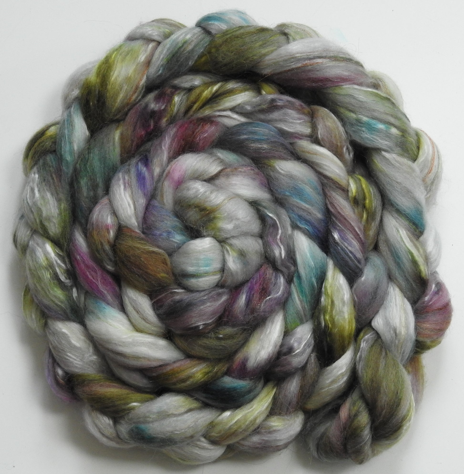 This custom blend has the softness of polwarth and alpaca and the shine and richness of mulberry and tencel with the sparkle of rainbow tribal firestar for a unique spinning experience.