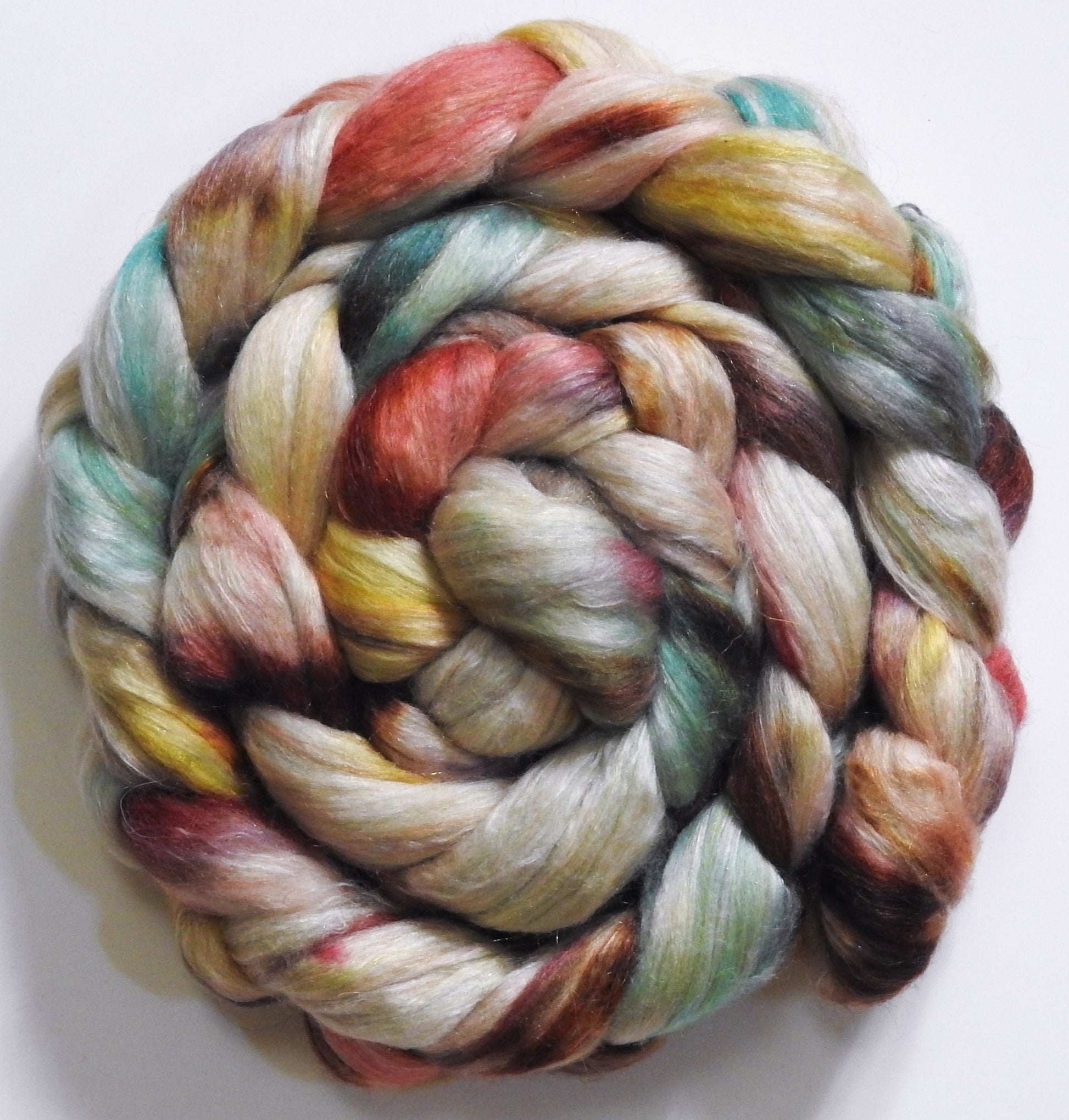 This custom blend has the softness of polwarth and alpaca and the shine and richness of mulberry and tencel with the sparkle of rainbow tribal firestar for a unique spinning experience.