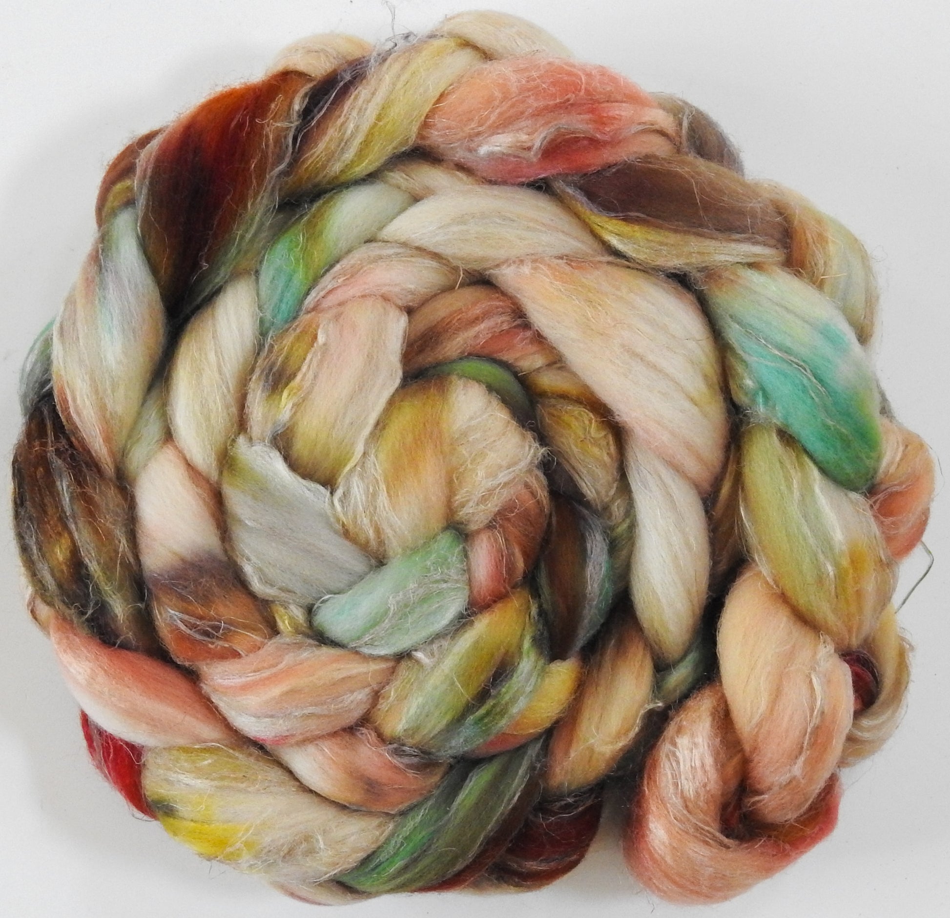 A fun textured blend we're trying out from what's readily available at the mill. Be prepared to pre-draft, and the flax will soften the more its handled!