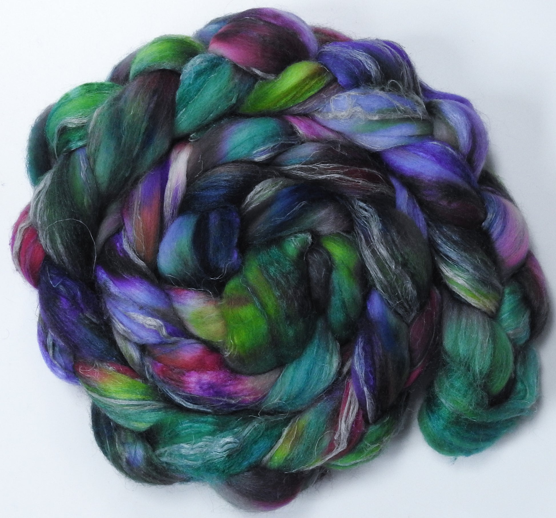 A fun textured blend we're trying out from what's readily available at the mill. Be prepared to pre-draft, and the flax will soften the more its handled!