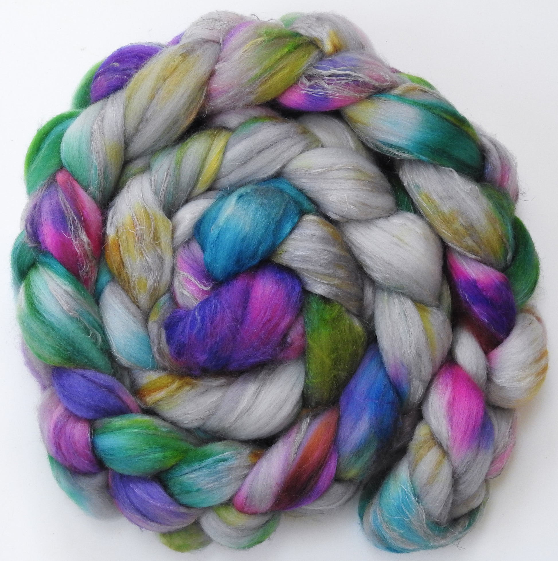 A fun textured blend we're trying out from what's readily available at the mill. Be prepared to pre-draft, and the flax will soften the more its handled!