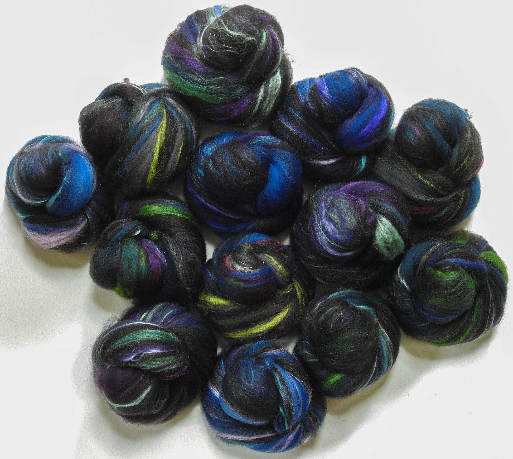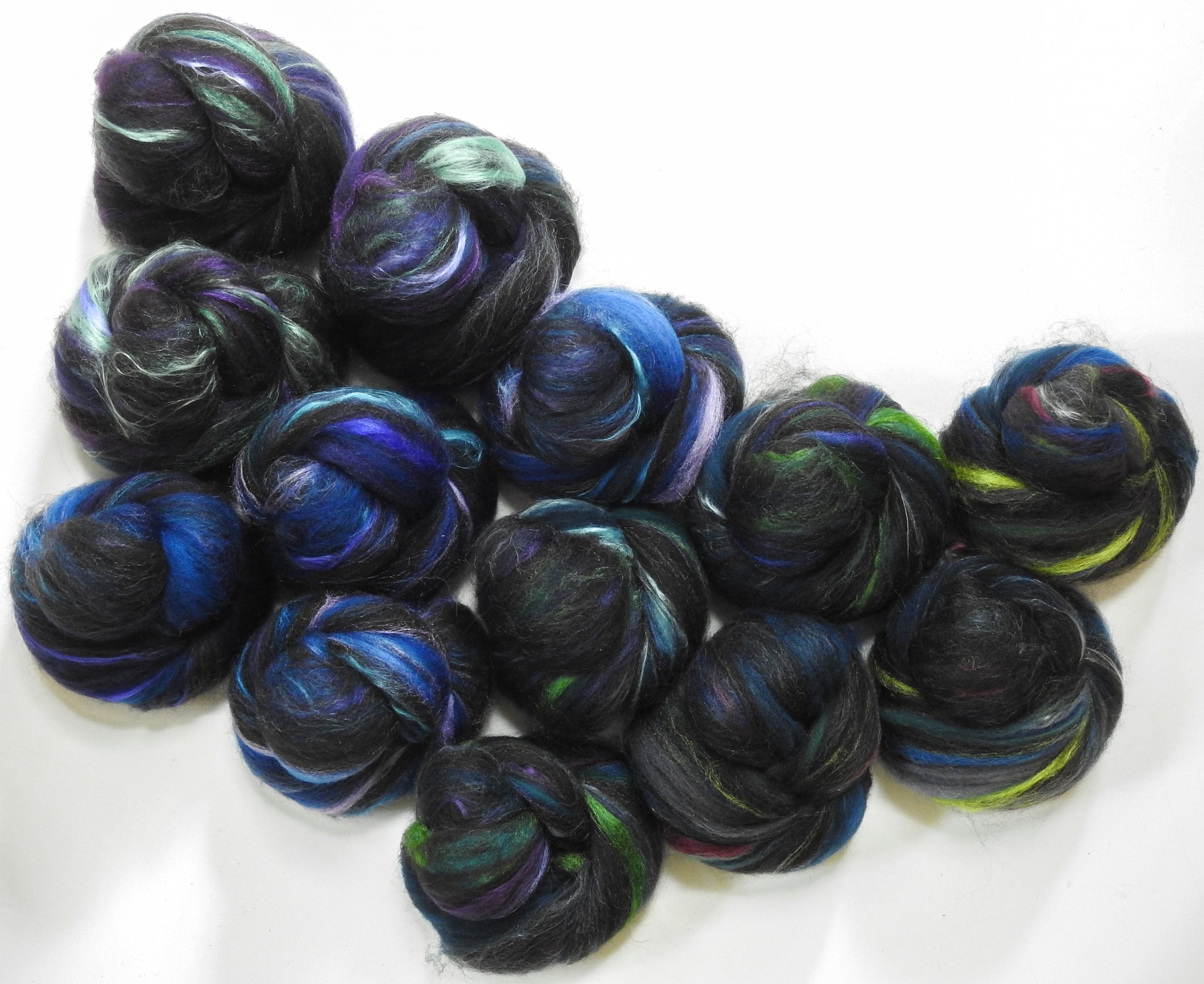 All batts are lovingly blended hand dyed fibers, carded by hand on fine tooth drum carders for your fiber crafting pleasure.
