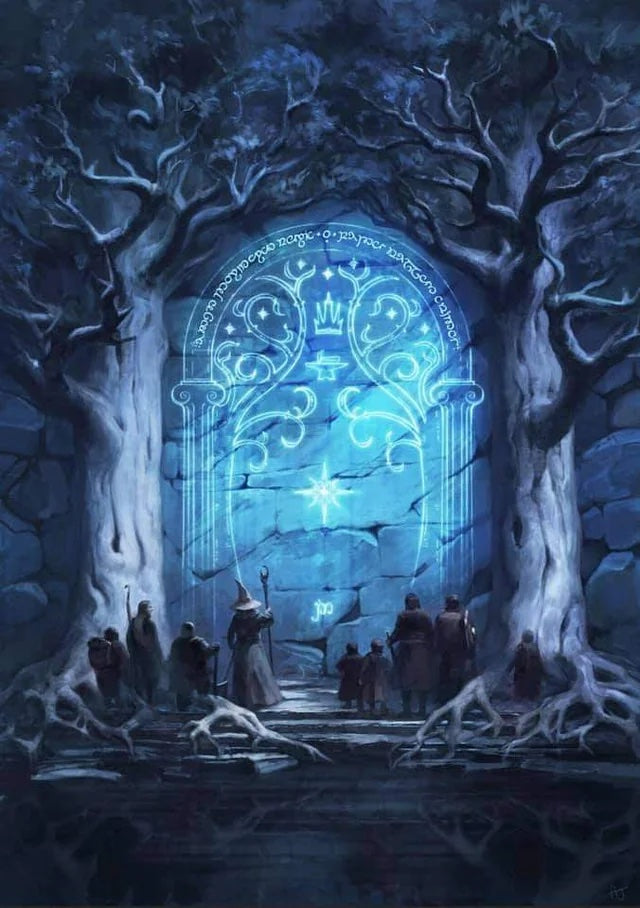 "Speak Friend and Enter" is the inscription on the Doors of Durin, which lead into the Mines of Moria, and is a riddle that requires the word for "friend" in the Elvish language to open the doors.