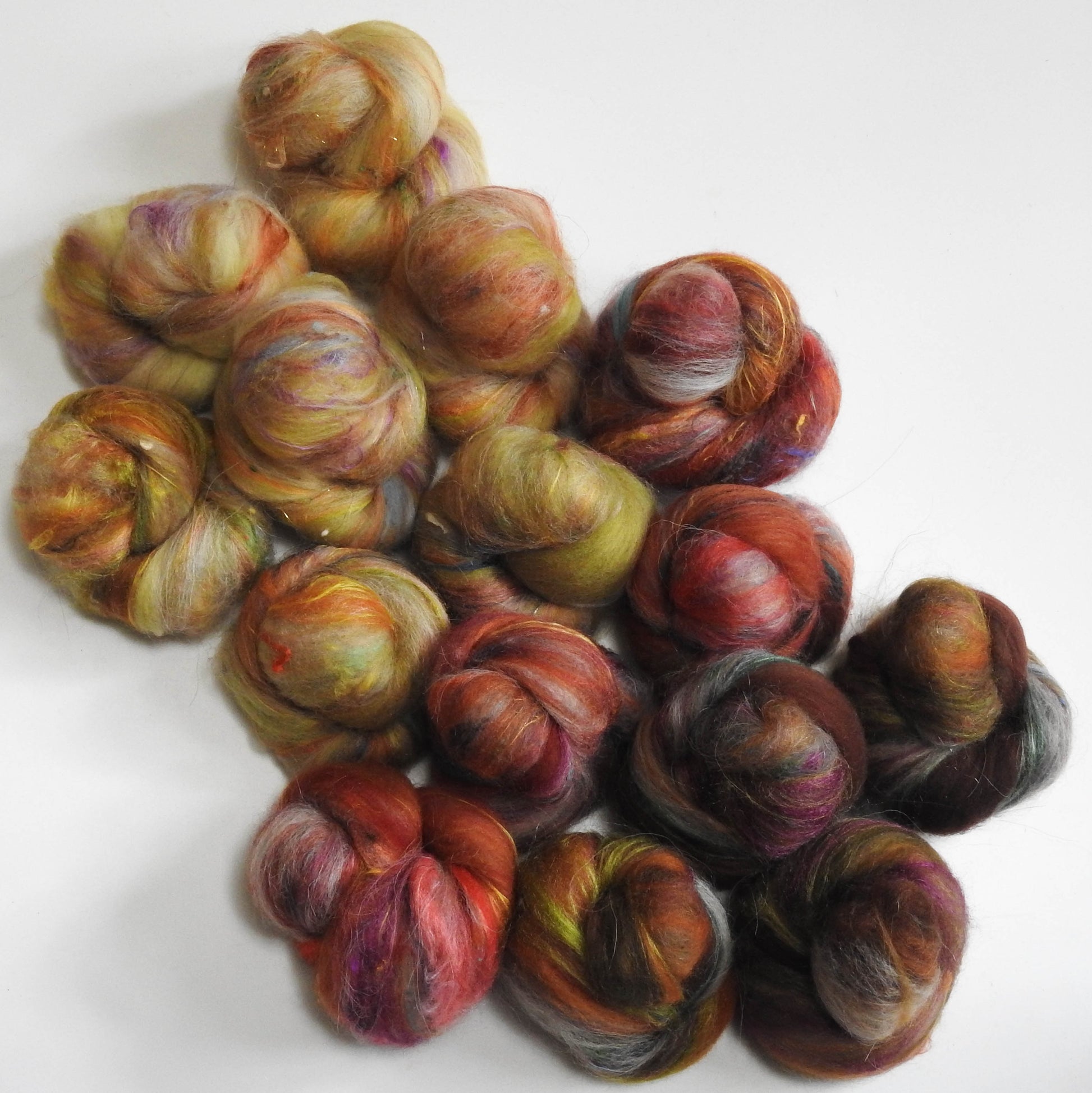 These are simpler, carded only once, with only Merino top, Camel and Faroe Island wool, silk with added touches of texture from our stash of previous carder extras...