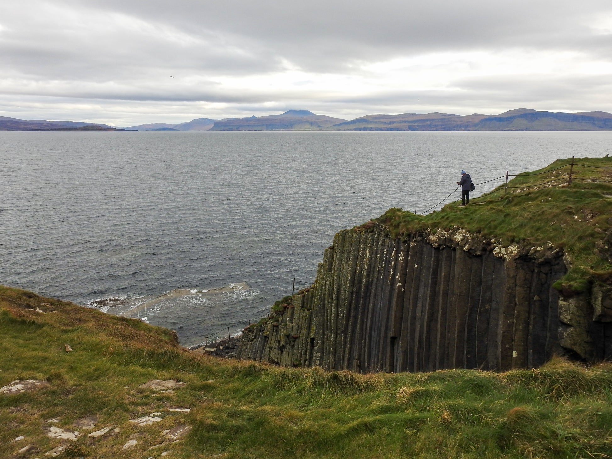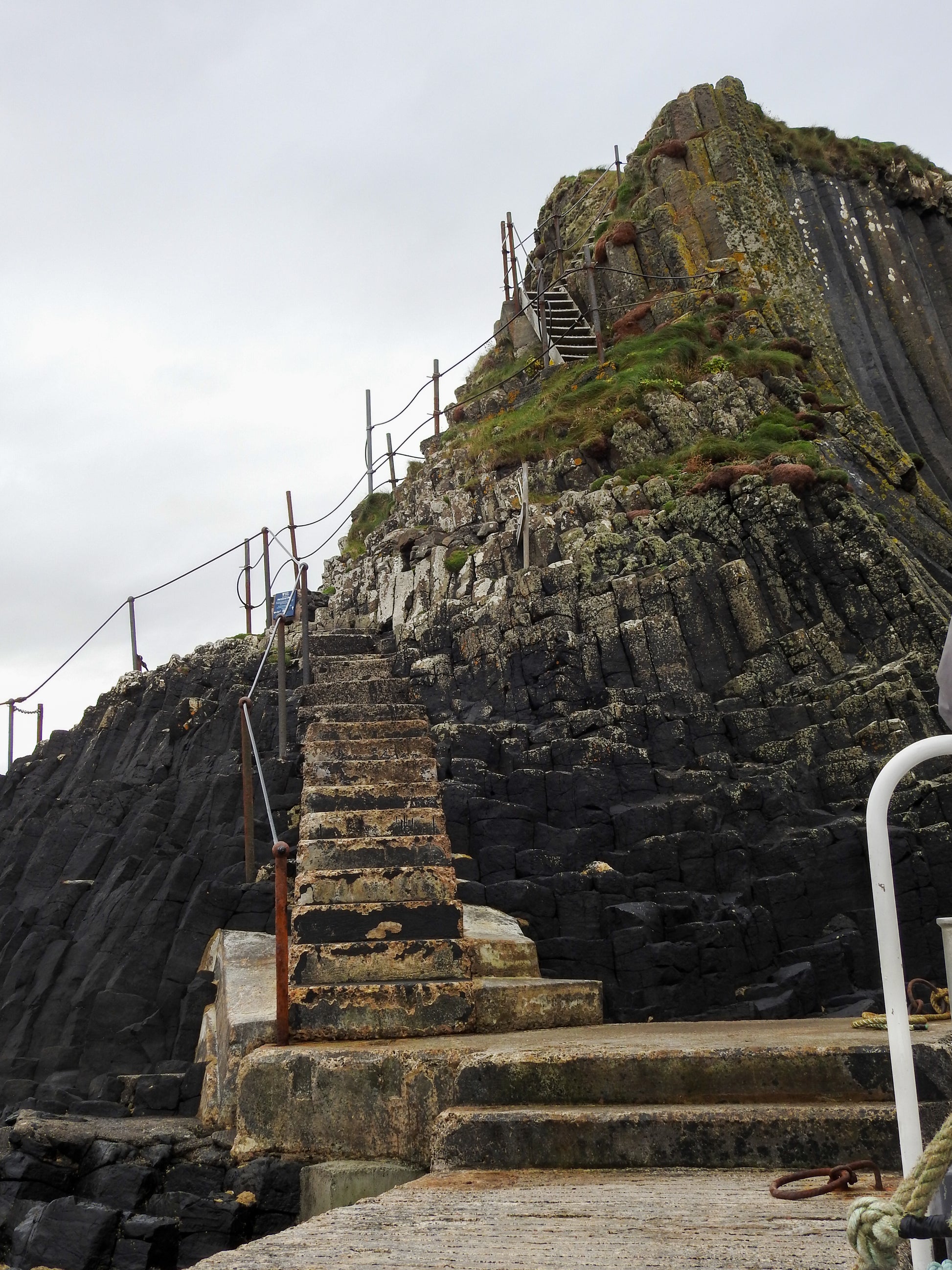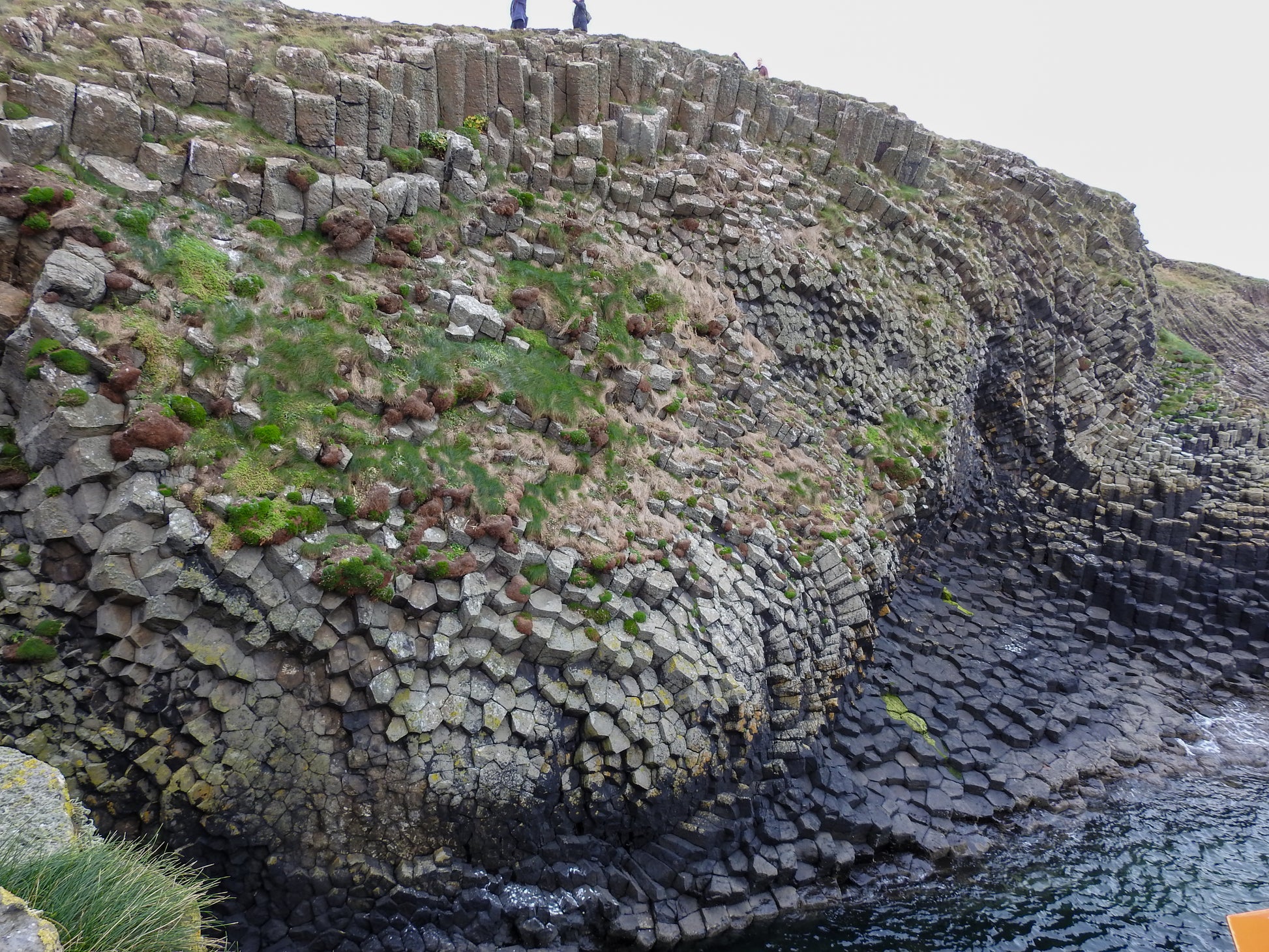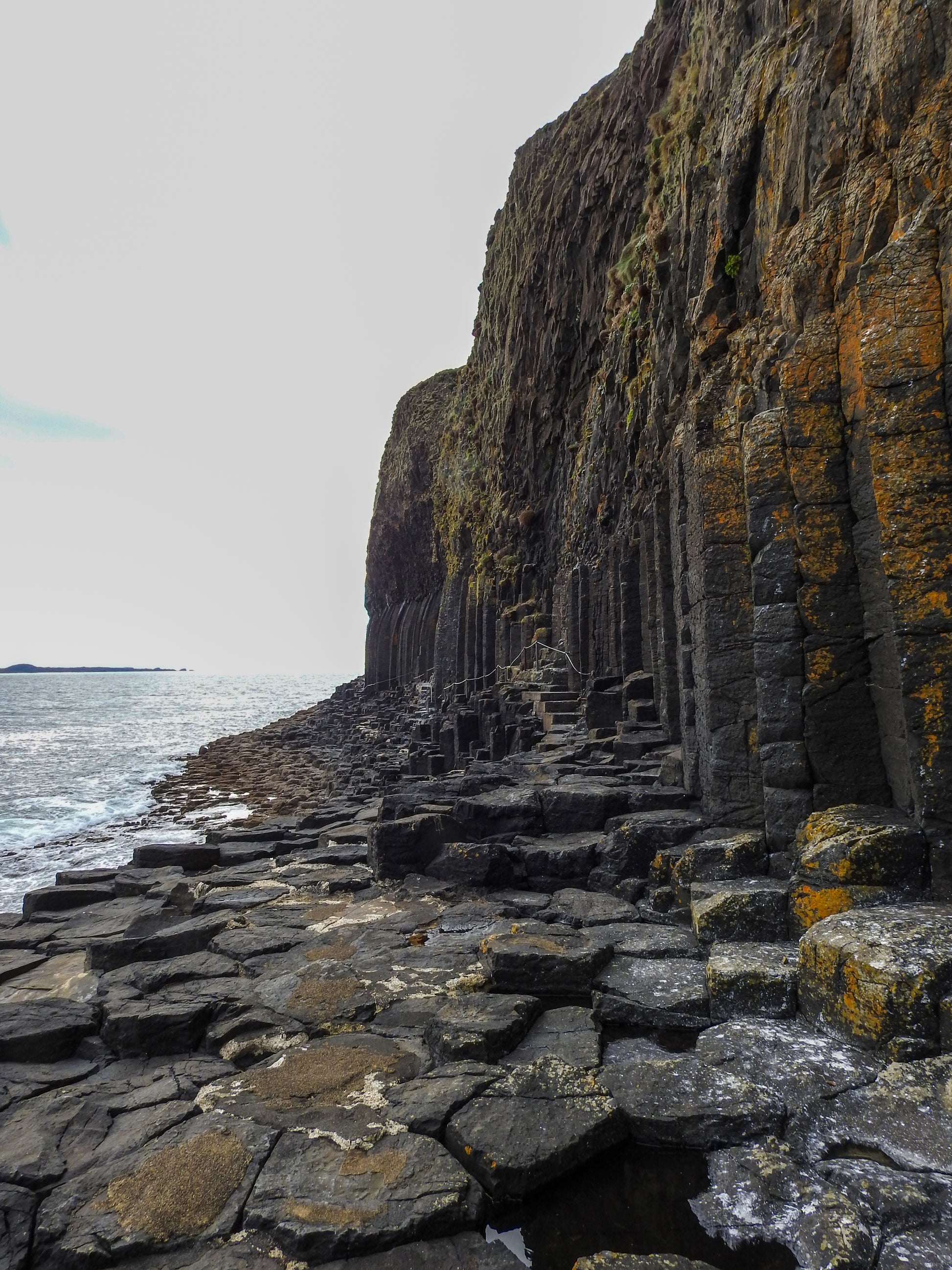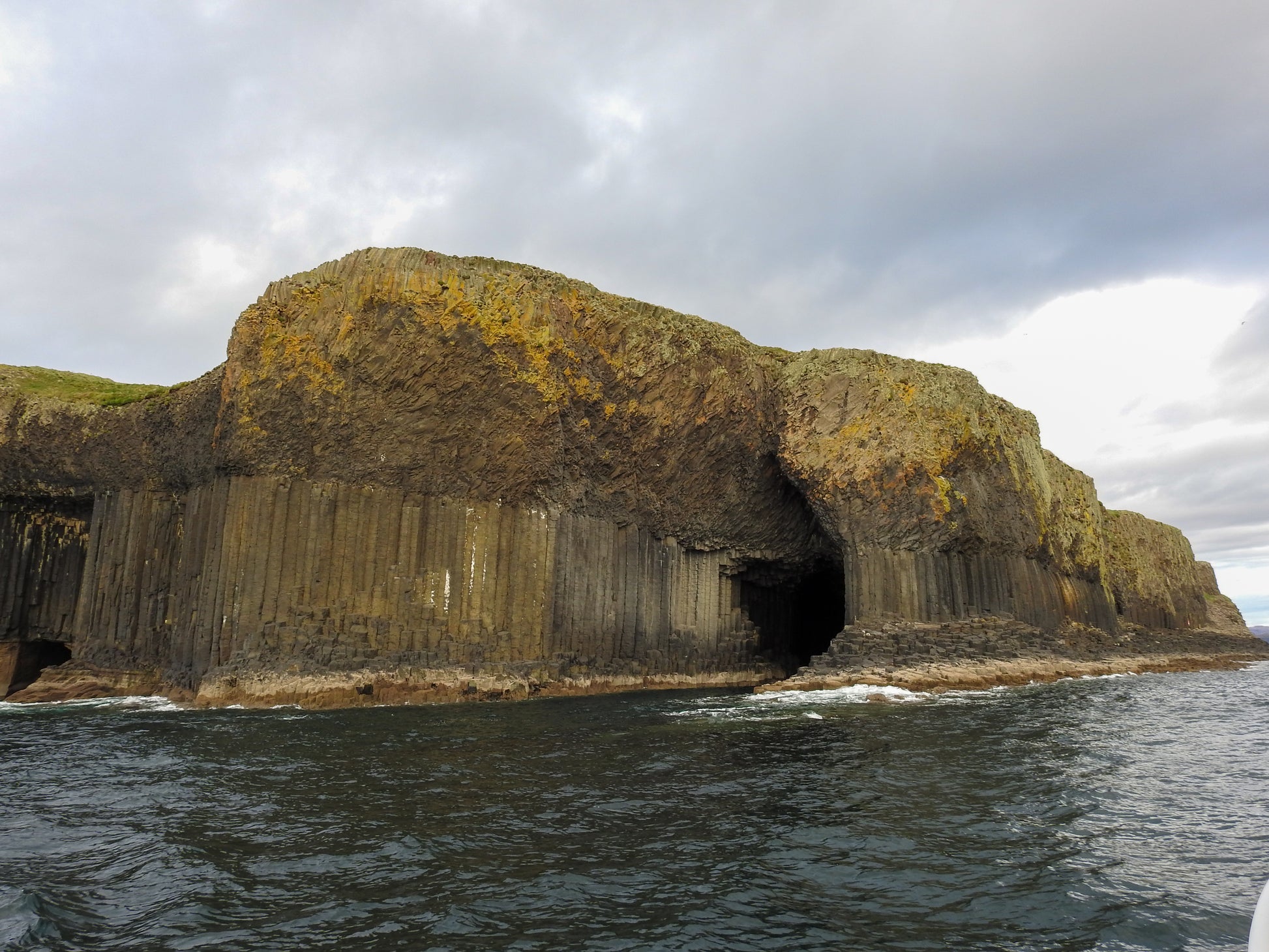 Staffa, which comes from the Old Norse word for "stave" or "pillar," is an uninhabited island about a half mile long and even less wide. Its notoriety springs from its structure of hexagonal basalt columns created by volcanic activity 60 million years ago! The same ancient lava flow formed the Giant's Causeway in Ireland, and according to legend the two were connected by the giant Fionn mac Cumhaill so he could cross from Ireland to Scotland. The striking sea cave naturally delved into the south side of Staffa is called Fingal's Cave, which is simply a corruption of Fionn mac Cumhaill's name, though the original Gaelic name for the cave was An Uamh Bhin, "The Melodious Cave."