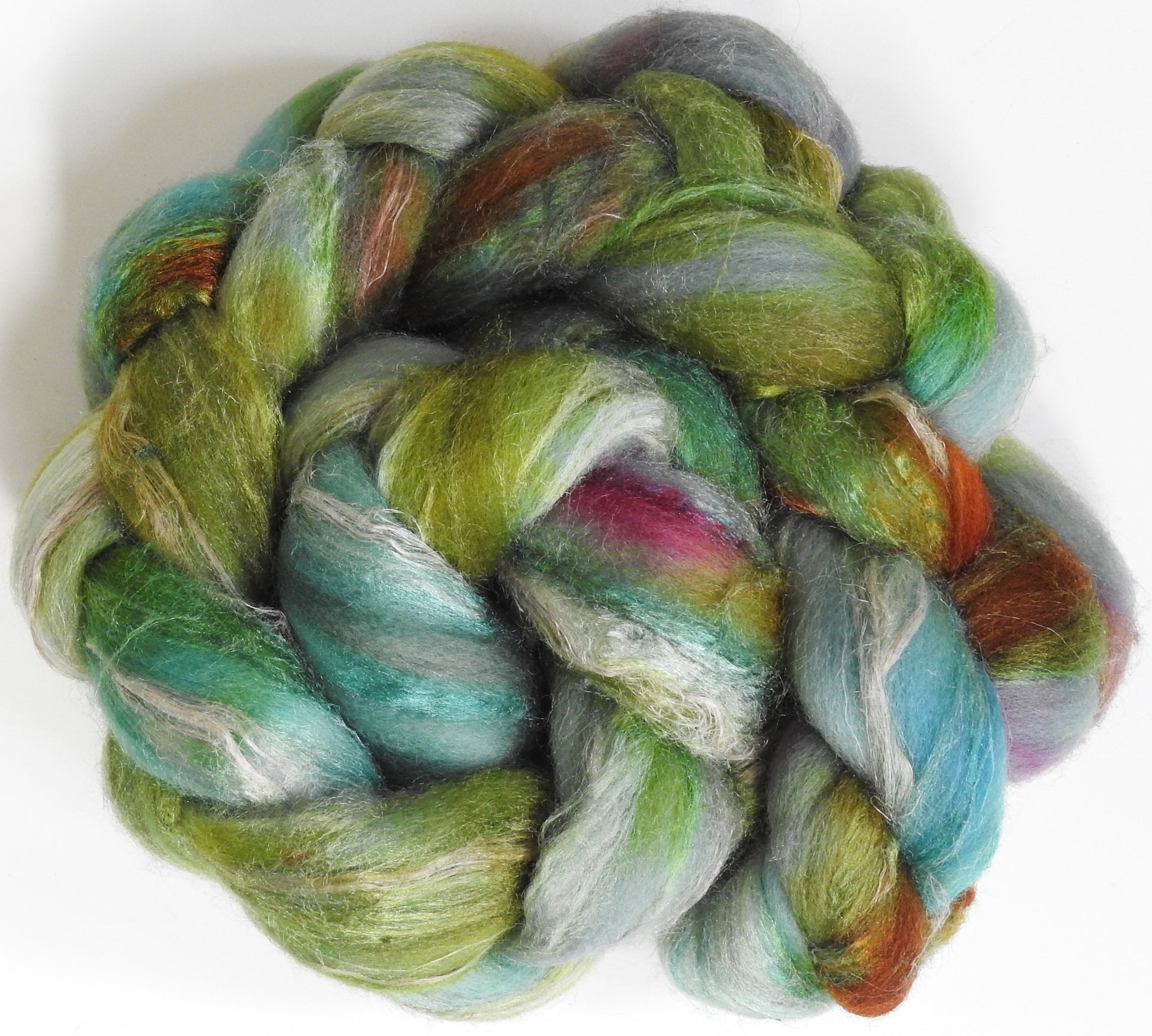 A fun textured blend we're trying out from what's readily available at the mill. Be prepared to pre-draft, and the flax will soften the more its handled!