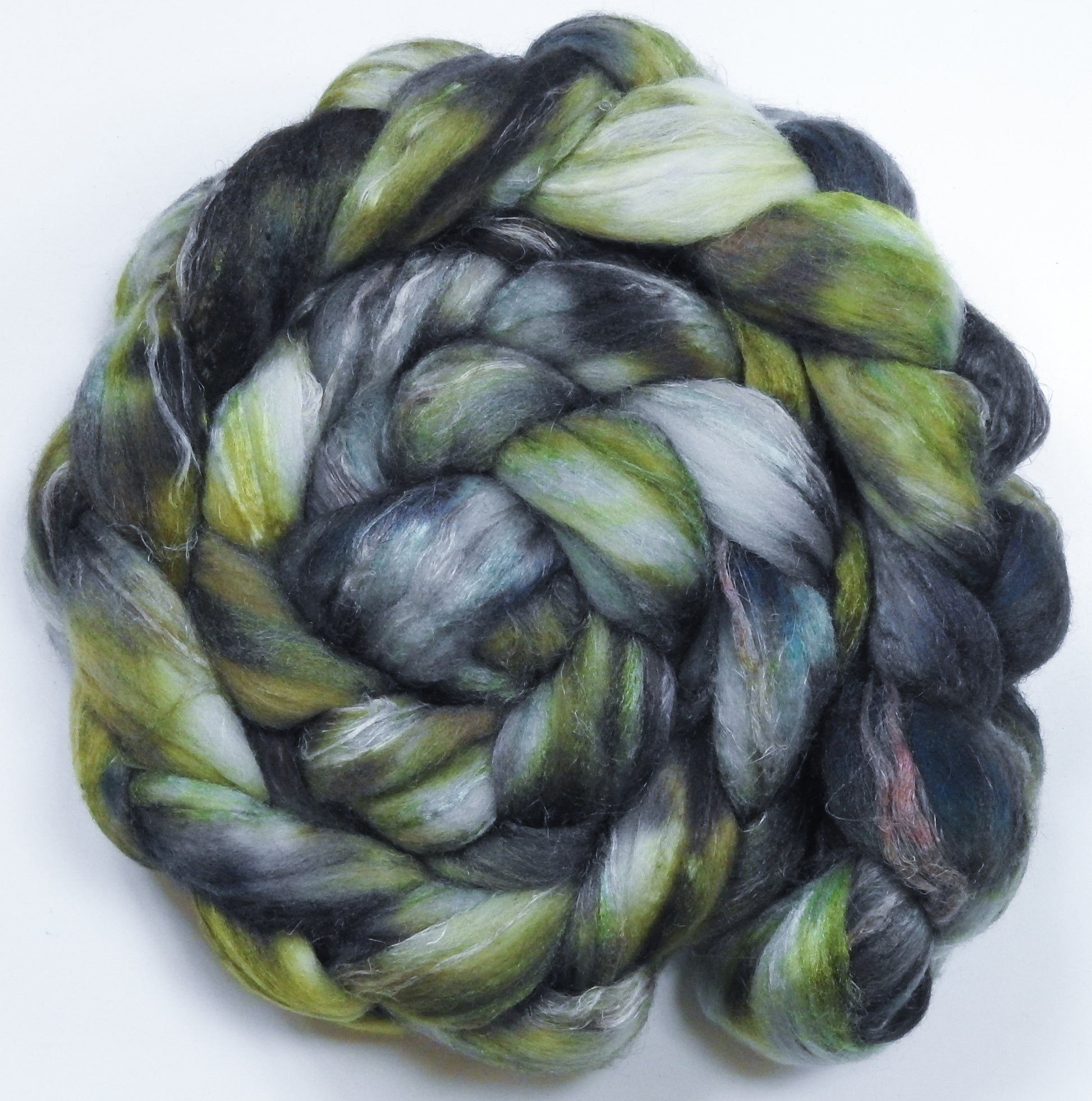 A fun textured blend we're trying out from what's readily available at the mill. Be prepared to pre-draft, and the flax will soften the more its handled!
