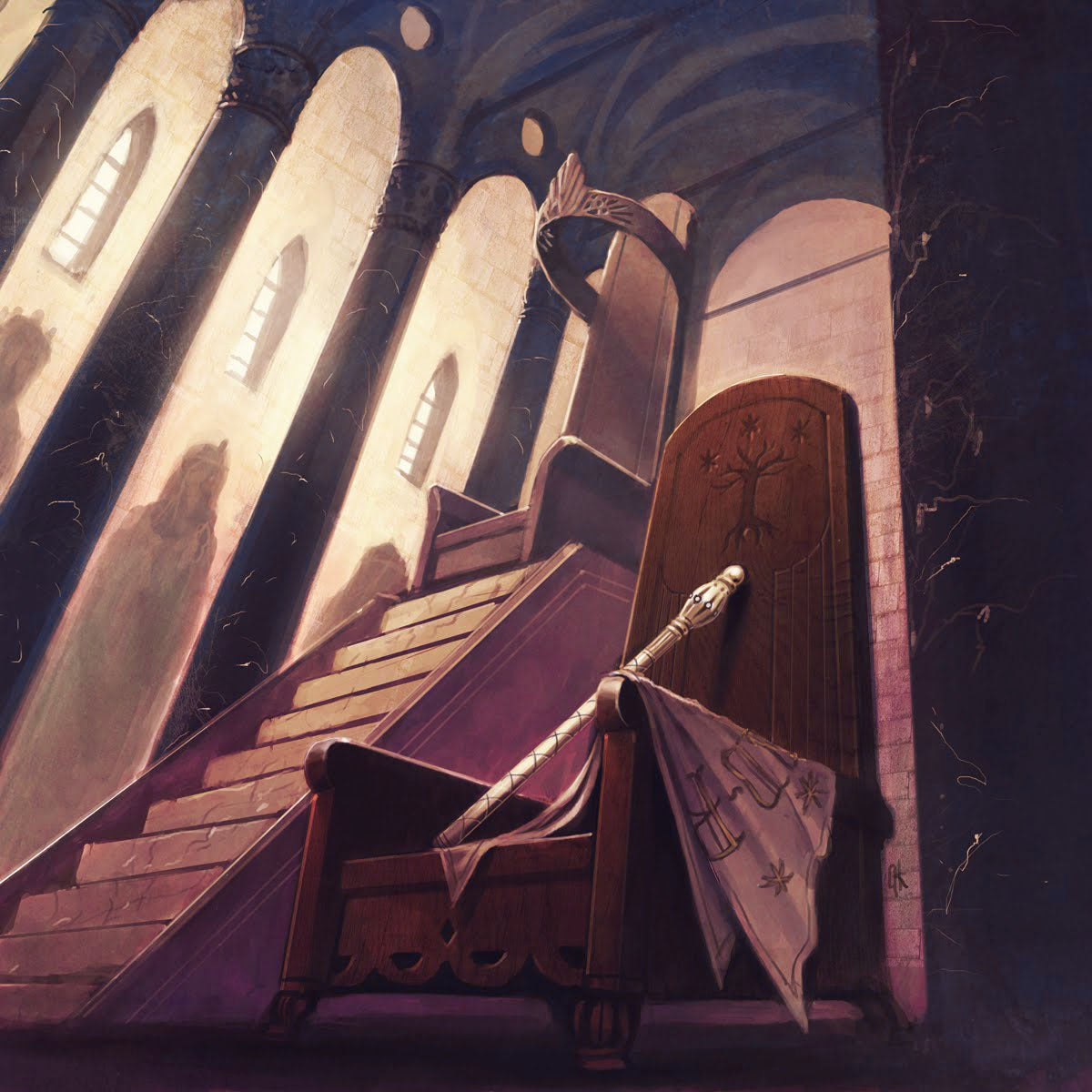 The Stewards of Gondor served as the chief high councillors to the Kings of Gondor. When the royal line failed, the Stewards became the de facto hereditary rulers, governing the realm until the rightful king, Aragorn II, returned to Minas Tirith.