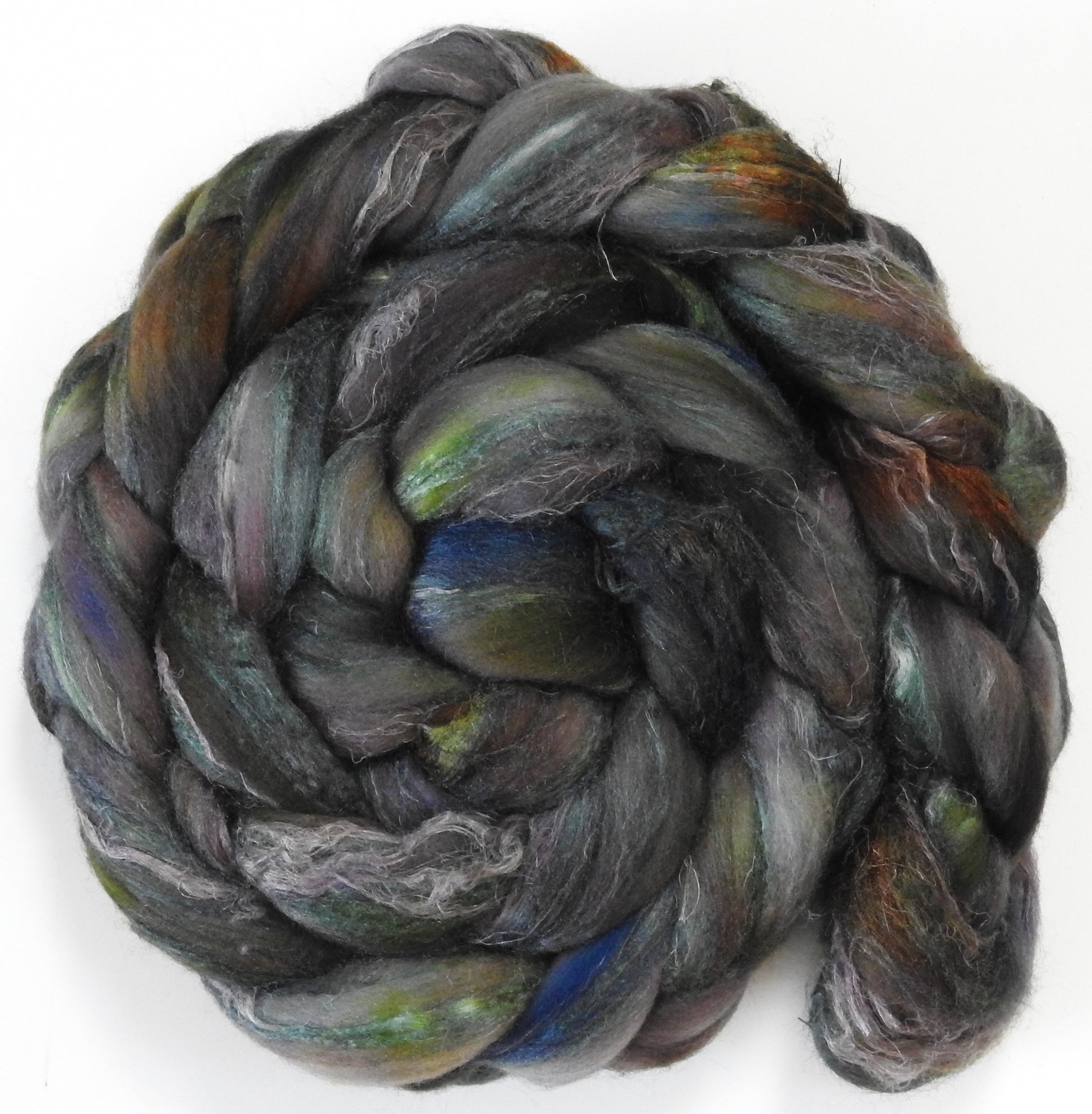 A fun textured blend we're trying out from what's readily available at the mill. Be prepared to pre-draft, and the flax will soften the more its handled!