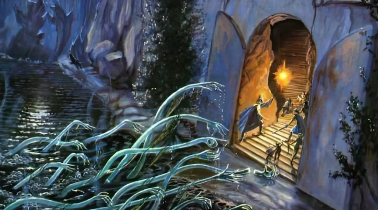 The Watcher in the Water is a mysterious water-monster that lurks in a dark lake beneath the rocky cliffs of the western Walls of Moria. Although its full shape is unknown, the Watcher is described as having many long, sinuous, pale-green, luminous tentacles.